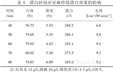 從表5 可知,白度隨處理時(shí)間的延長(zhǎng)先升后降,黃度先降后升,強(qiáng)力損傷依次下降.毛效隨處理時(shí)間延長(zhǎng)而提高,≥60 min 時(shí)趨緩.綜合考慮,漂白時(shí)間以60min 為宜.