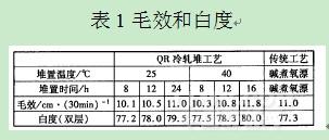 QR冷軋堆工藝在25℃和40℃溫度下堆置不同時(shí)間,測(cè)試織物的毛效和白度,并與傳統(tǒng)工藝比較,結(jié)果見表1。