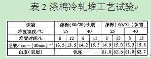 由表2知,與全棉織物相比,滌棉織物工藝助劑用量低,堆置時(shí)間縮短,也可以得到較好的毛效和白度。大生產(chǎn)時(shí)可根據(jù)實(shí)際要求設(shè)定堆置時(shí)間。