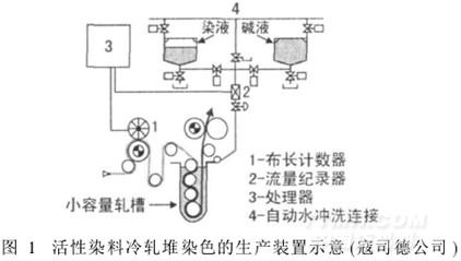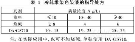 若采用泡花堿和燒堿作為堿劑,即使采用圖1所示的生產(chǎn)設(shè)備,染液的穩(wěn)定性仍很難得到有效控制,產(chǎn)品的一次染色成功率依然很低。因此,研究活性染料染液穩(wěn)定性,提高活性染料冷軋堆染色的一次成功率,是推廣這種節(jié)能減排清潔染色工藝的關(guān)鍵之一。本研究在活性染料染液中,自主研發(fā)了染液穩(wěn)定劑DA-GS710,并應(yīng)用于生產(chǎn)實踐。