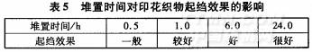 織物浸堿后堆置時(shí)間要適當(dāng)延長,目的是充分堿縮。堿縮越充分,起縐透明印花越明顯,起縐透明效果越好,結(jié)果見表5。