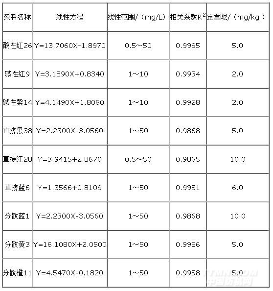 表2 9種染料的線性回歸方程與定量限