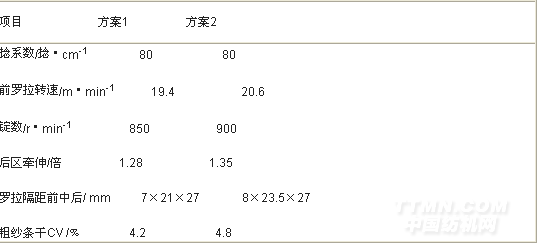 減小羅拉隔距,有利于對牽伸區(qū)內(nèi)浮游纖維的控制,同時適當(dāng)減小后區(qū)牽伸倍數(shù),發(fā)揮主牽伸區(qū)的作用,有利于提高粗紗的條干CV 值。