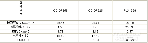2.2 CD-DF858是經(jīng)過醚化、酯化預(yù)處理后,再進(jìn)行接枝共聚的多元復(fù)合變性淀粉為主,通過先進(jìn)工藝加入特殊高聚物制成。其粘度低,流動(dòng)性好,對(duì)紗線的浸透性能好,不含PVA,適用于純棉、滌棉高支高密的經(jīng)紗上漿,可完全取代PVA,其BOD5/COD=0.286基本達(dá)到環(huán)保要求。