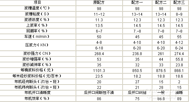 表四 幾個(gè)主要產(chǎn)品漿料配方及織造效率