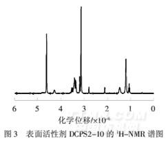 從圖3可以看出,3.14×10-6處為季銨鹽甲基上氫(a)的信號(hào),3.43×10-6處出現(xiàn)羥基上氫(d)的信號(hào),4.29×10-6處為與羥基相連碳原子上氫(c)的信號(hào),1.21×10-6處出現(xiàn)分子中長碳鏈亞甲基上氫(h)的信號(hào),1.48×10-6處出現(xiàn)醚鍵隔一位的亞甲基上氫(g)的信號(hào),在(3.18~3.37)×10-6集中出現(xiàn)了醚鍵兩邊和與氮原子相連的亞甲基上氫原子(b、e、f)的信號(hào).