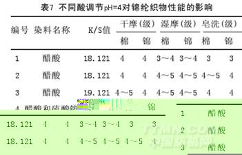 用醋酸調(diào)節(jié)pH值或用醋酸調(diào)節(jié)pH(其它的工藝條件同上面的工藝)時(shí)對(duì)織物染色K/S值結(jié)果如表7。