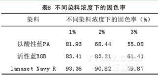 由表8可以看出:隨著染料濃度的增加,固色率反而減小,說(shuō)明染料濃度越大上染率可能會(huì)降低,直接影響固色的效果。總體來(lái)看,染料濃度較低時(shí),固色率都挺高,說(shuō)明在上染率好的基礎(chǔ)上,固色效果也會(huì)明顯。