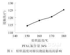 由圖1可看出,焙烘溫度越高,織物的拒水性能越好.因為在焙烘過程中,溫度過低不能保證整理劑與織物發(fā)生化學(xué)鍵合,也不利于整理劑分子間交聯(lián)成膜.且隨著溫度升高,焙烘時整理劑的分子熱運動加快,含氟基團就更容易遷移到表面形成致密的疏水層,達到更好的拒水性能.通常,棉織物整理時焙烘溫度為150~180℃.但溫度太高會破壞棉纖維的結(jié)構(gòu),影響織物的強力和白度等,因此,選用焙烘溫度為170℃,并且用于指導(dǎo)PFA2和PFA3整理劑乳液對棉織物的整理.