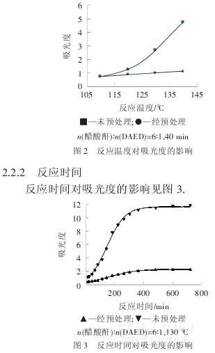 以P2O5與濃H2SO4制備三氧化硫并作為預處理劑對醋酸酐進行預處理.反應溫度和反應時間對黑色副產(chǎn)物的產(chǎn)生影響較大,n(醋酸酐)∶n(DAED)的影響很小.經(jīng)預處理的醋酸酐與DAED反應,當反應時間超過360min后,黑色副產(chǎn)物的濃度不到相同條件下未預處理時的1/5,顯示出醋酸酐預處理對黑色副產(chǎn)物的產(chǎn)生具有良好的抑制作用.