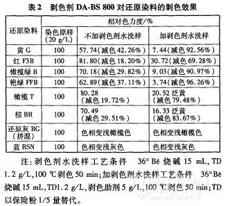 (1)還原染料剝色劑DA—BS800,對(duì)還原染料染色物的剝色(減色),具有卓越的助剝功效,能將剝色(減色)率從常規(guī)的20%提高到80%,從而使還原染料染色織物的修色或復(fù)染成為可能。