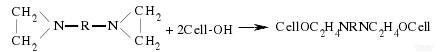氮丙環(huán)是一種含氮的三元環(huán)化合物,又稱為乙撐亞胺、亞甲基亞胺、丙啶等,是一種反應能力很強的三元環(huán)化合物,與織物中的氨基、羧基、羥基等基團反應,可以提高織物的抗皺、防縮性能;與粘合劑、涂層膠中的羧基、羥基、氨基等反應可提高干、濕摩擦牢度及耐皂洗性能.[21]此類化合物用作交聯(lián)劑與纖維素纖維形成交聯(lián)反應[22],反應式如下: