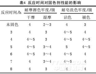 在20~25℃的條件下。當(dāng)二乙烯三胺滴完后升溫至70℃左右,通過(guò)改變反應(yīng)時(shí)間來(lái)研究其對(duì)固色劑性能的影響,其結(jié)果如表4所示。