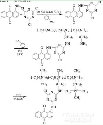活性染料具有分子小、便于擴散和遷移、勻染性好等優(yōu)點,但存在易水解、固色率低以及在染色過程中需要加入大量的鹽促染等缺點,增加了印染廢水的處理難度,造成了嚴重的環(huán)境污染.為此,染色工作者們都在積極探索如何減少活性染料水解和活性染料的無鹽染色方法,合成陽離子型高分子活性染料就是其中的一種解決辦法.高分子染料是指發(fā)色體與高分子骨架以共價鍵相結合的化合物,作為一種功能性的高分子,它具有小分子染料的鮮艷色彩、著色能力,又具有高分子材料的耐溶劑性、相容性和衛(wèi)生性等優(yōu)點.而且高分子染料分子質量較能提高染料對纖維的親和力,減少水解,提高染料利用率.本文以聚乙烯亞胺為高分子骨架,通過化學改性法,連接單活性基的2-(1-蒽醌基氨基)-4,6-二氯-1,3,5-三嗪染料母體,然后對聚乙烯亞胺高分子進行季銨化改性,制得一種高分子陽離子活性染料.