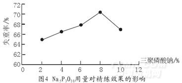 由圖4可得出結(jié)論,當(dāng)Na5P3O10的用量為8%(omf)時,失重率最大為70.20%,可以獲得最佳的處理效果。