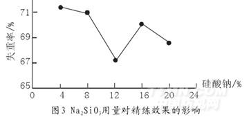 由圖3可得出結(jié)論,當(dāng)Na2SiO3的用量為4%(omf)時,失重率最大為71.41%??梢垣@得最佳的處理效果。