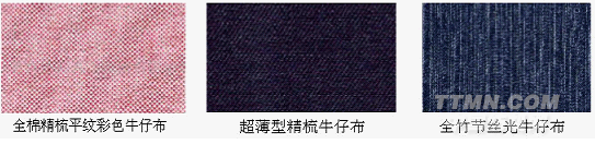 牛仔布是以純棉靛藍(lán)染色的經(jīng)紗與本色的緯紗,采用三上一下的右斜紋組織交織而成,一般可分為輕型,中型,和重型三類。布的寬度大多在114- 152公分之間。