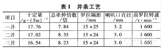 該工序采取“重加壓,大隔距,大牽伸”的工藝原則,適當降低車速,防止絹絲、色棉纏繞羅拉膠輥,加壓量應(yīng)適當增加,以保證足夠的握持力。適當加大羅拉隔距,相對濕度掌握在65%左右,以減少靜電對生產(chǎn)的不良影響。注意紗條通道光潔,喇叭F3直徑大小適中,適當加大圈條張力,避免條子掛花、堵塞。由于棉條Il}|含有20%的絹絲纖維,因此在紡紗中靜電現(xiàn)象較大,采用經(jīng)復(fù)合涂料處理的中硬度膠輥,能夠有效地減少纏繞歲拉膠輥現(xiàn)象發(fā)生。并條工序工藝配置如表1。頭道為2根色棉條、6根棉絹絲混條并合,二道和三道均為8根并合。