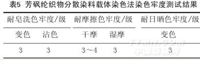 芳砜綸織物采用分散染料載體染色法最佳工藝染色后的色牢度結(jié)果如表5所示。