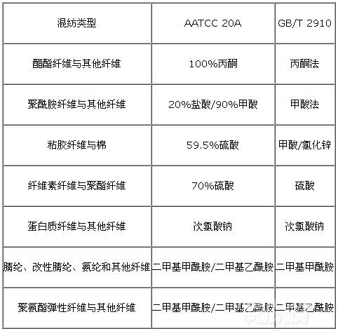 在進(jìn)行相同的纖維含量分析過程中,AATCC與我國標(biāo)準(zhǔn)在溶解過程中試劑的選擇有異同(見表 2)。