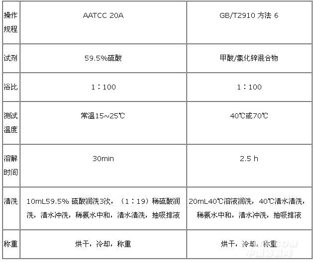 兩個標(biāo)準(zhǔn)要求的測試操作程序不同,其中最有代表性的是粘膠纖維與棉的化學(xué)分析法(見表 3)。