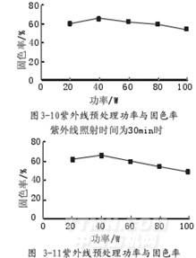 由圖3-6到圖3-11可見,不同的紫外線功率預(yù)處理時間對上染率提高的規(guī)律不同,也有一個明顯的峰值。隨著處理功率的增大,上染率有下降趨勢時間越長這種趨勢越明顯。原因功率過高,輻射能中高能活性粒子數(shù)量增多和能量增大,纖維素被氧化的程度越激烈,降低對染料的吸附能力[4-5],導(dǎo)致上染率達(dá)到峰值后開始回落。