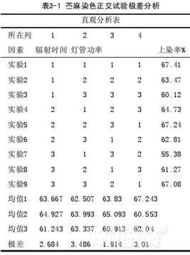 活性染料染苧麻正交試驗(yàn)極差分析見表3-1