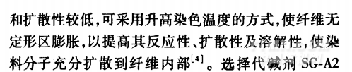 從表1可知,兩只染料的比移值甩都小于0.9,表明染料直接性小【2】。這兩只染料的分子結(jié)構(gòu)均較大.吸附與擴(kuò)散速率較慢,移染性差,染色平衡時(shí)間相對較長,容易染花?;钚源渌{(lán)一般為酞菁染料,其母體分子較大,所以溶解度較低口J。由于鹽析效應(yīng),活性翠藍(lán)溶解性會(huì)進(jìn)一步降低,造成染料凝聚,形成表面染色,對勻染不利。因此,要解決T/R針織布翠藍(lán)色花,要從提高染料的反應(yīng)性、擴(kuò)散性,以及降低固色速率和減少固色色花等方面著手。
