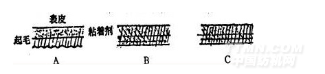 層壓工序是合成革生產(chǎn)中的關(guān)鍵部份,掌握好層壓條件,對產(chǎn)品的質(zhì)量風(fēng)格具有極大的影響,而不適當(dāng)?shù)膶訅簵l件,造成產(chǎn)品剝離強度的下降、或轉(zhuǎn)移后花紋的不清晰,以及表面起縐現(xiàn)象……等等。以起毛布的層壓為例,當(dāng)粘合劑浸漬起毛部的2/3情況下[圖4(C)]合成革表面平正狀態(tài)好,見圖4所示;