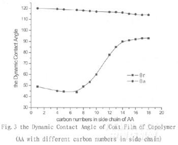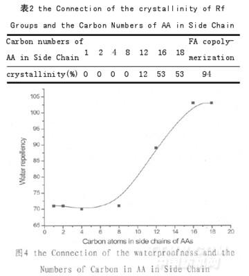 由表2可知,AA側(cè)鏈烷基碳原子數(shù)12以上開(kāi)始結(jié)晶,達(dá)到18明顯結(jié)晶,與FA共聚結(jié)晶度提高。AA側(cè)鏈與全氟烷基結(jié)晶后遇水不易回縮,AA側(cè)鏈、全氟烷基指向空中防水性好。若AA側(cè)鏈碳原子數(shù)8以下不結(jié)晶,遇水后全氟烷基由指向空中回縮涂膜內(nèi),水接觸織物而產(chǎn)生潤(rùn)濕。