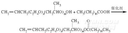 在裝有分水器和回流冷凝器的250 mL 三口燒瓶中加入烯丙基聚氧乙烯聚氧丙烯醚、對苯二酚(阻聚劑)、沸石、甲苯(攜水劑)、對甲基苯磺酸(催化劑),攪拌升溫至催化劑完全溶解,取0.5 g 左右試樣測空白酸值.加入月桂酸后,待其完全溶解,再取0.5 g 左右試樣測起始酸值.加熱至130 ℃,每隔1 h 測一次酸值,反應(yīng)6.5 h,酯化率為87.56%,至酯化率幾乎不變時停止加熱,降溫至70 ℃后用氫氧化鉀水溶液中和至中性,加入飽和氯化鈉溶液萃取,除去鹽類雜質(zhì).反應(yīng)式如下: