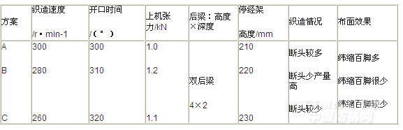 (2)方案C中適當(dāng)降低車速,推遲開口時(shí)間,解決了劍頭刮紗引起斷頭問題,但開口太遲,仍出現(xiàn)少量脫緯現(xiàn)象。