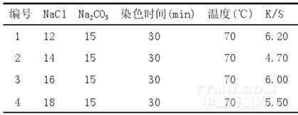 依據(jù)正交實驗得出的氯化鈉濃度的優(yōu)水平,改變氯化鈉濃度,從而研究其最佳點。實驗方案及結(jié)果參見表3,織物2g,浴比1:50。