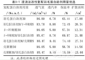從表3-1可以看出,羽毛蛋白助劑與殼聚糖復(fù)配為30/5(%,o.m.f.)時(shí),滌綸織物的透氣率、保溫率最好,擴(kuò)散面積最大,透氣量比較小。這是因?yàn)闅ぞ厶桥c羽毛蛋白助劑之間存在著較強(qiáng)的氫鍵作用,兩者基本相容。殼聚糖分子中含有羥基,乙酰氨基和氨基等活潑基團(tuán),有很好的生物相容性,將復(fù)配羽毛蛋白助劑在滌綸織物表面形成一層不完整的膜,使得滌綸織物的透氣性能下降不大。所以,將殼聚糖處理到滌綸織物上,使織物的舒適性能提高。β-環(huán)糊精也是親水性高分子物質(zhì),但它與羽毛蛋白助劑的相容性不好,研究中發(fā)現(xiàn),β-環(huán)糊精和羽毛蛋白同時(shí)處理織物會(huì)產(chǎn)生絮凝狀物質(zhì),影響織物的舒適性能,所以選取復(fù)配蛋白助劑用量為:羽毛蛋白助劑與殼聚糖復(fù)配為30/5(%,o.m.f.)。
