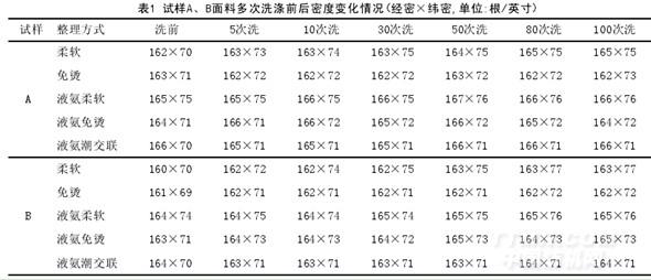 通過表1可看出,與其它整理方式相比,柔軟整理牛津紡面料的定型性較差,隨水洗次數(shù)的增加,經(jīng)緯向逐漸收縮,密度增加。100次洗后經(jīng)密分別比洗前增加3根,即緯向平均收縮2%。兩面料緯密分別增加5根和7根,平均經(jīng)向收縮達(dá)7%。