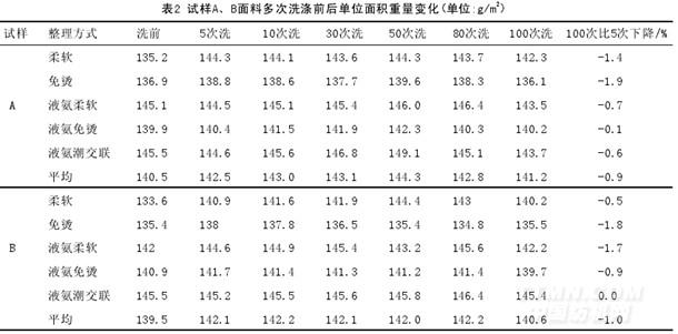不同整理方式相比,可看出潮交聯(lián)比柔軟、免燙整理的面料克重高7.5%左右,主要原因是潮交聯(lián)整理助劑用量多,吸收助劑多增重。