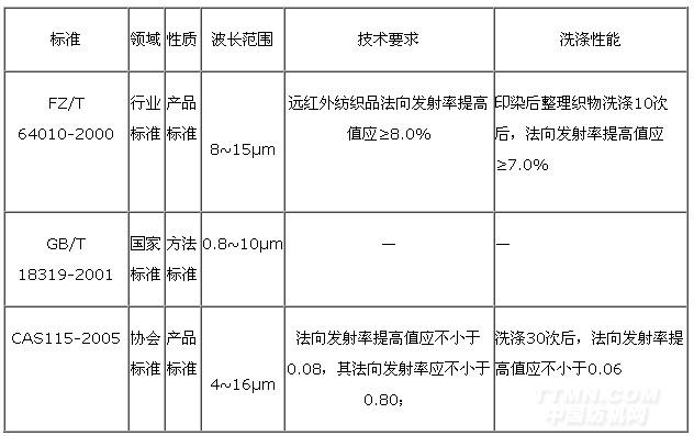 目前關(guān)于遠(yuǎn)紅外紡織品功能測(cè)試標(biāo)準(zhǔn)主要有國(guó)家標(biāo)準(zhǔn)GB/T 18319—2001《紡織品紅外蓄熱保暖性的試驗(yàn)方法》、紡織行業(yè)標(biāo)準(zhǔn)FZ/T 64010—2000《遠(yuǎn)紅外紡織品》、中國(guó)標(biāo)準(zhǔn)化協(xié)會(huì)標(biāo)準(zhǔn)CAS 115—2005《保健功能紡織品》。