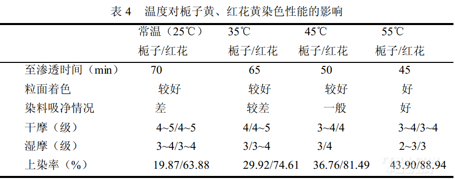 表4中單獨(dú)用梔子黃和紅花黃的染料用量分別為7.0%、3.5%。溫度對(duì)于染料影響較為復(fù)雜,高溫可以促進(jìn)染料的溶解和分散,減少染料的聚集,使分子運(yùn)動(dòng)加快,提高染料的滲透性能和上染率,但是高溫也會(huì)引起革粒面粗糙,甚至出現(xiàn)局部收縮,根據(jù)表4的試驗(yàn)結(jié)果,天然梔子黃和紅花黃的染色溫度選在50~55℃為宜。
