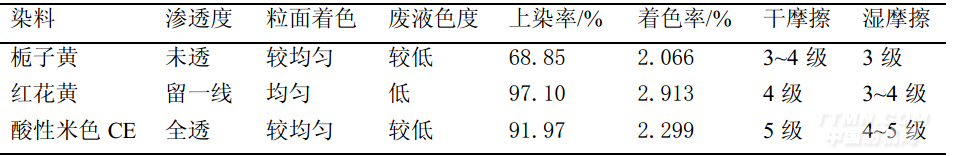 著色也令人滿意,滲透性稍差,摩擦色牢度低1級(jí)可能與樣品得色有關(guān),天然梔子黃的各項(xiàng)