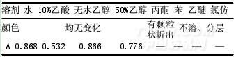 常溫條件下,將色素濃縮液分別用水、10%乙酸、無水乙醇、50%乙醇、丙酮、苯、乙醚、氯仿按照1:1(體積比)稀釋進行溶解性試驗(10%乙酸按1:2進行),如表3。