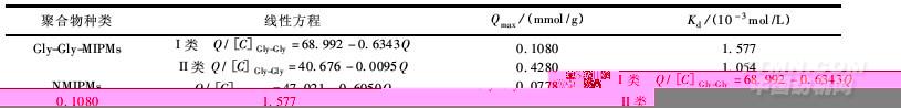 2.19,且通過薄層色譜分離實驗進一步證明Gly-Gly-MIPMs具有特異選擇吸附性。根據(jù)Scatchard模型分析得出Gly-Gly-MIPMs的高結合位點的單位飽和吸附量是NMIPMs的5.50倍,這充分說明所制備的Gly-Gly-MIPMs對Gly-Gly分子具有較強的特異性吸附。