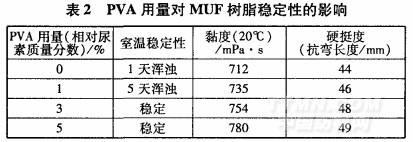 聚乙烯醇(PVA)是一種很好的膠黏劑,能與甲醛或脲醛的初縮體進(jìn)行反應(yīng),增加樹脂的黏著力,同時(shí)具有一定的捕醛作用。改性劑PVA的加入量對(duì)MUF樹脂的穩(wěn)定性影響見表2。