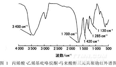 對合成的丙烯酸-乙烯基吡咯烷酮-馬來酸酐三元共聚物Poly(AA-MA-VP)進(jìn)行紅外光譜分析,如圖1。