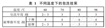 皂洗劑在使用過程中受溫度的影響很大,為測試皂洗溫度對洗滌效果的影響,取JY-1103D用量1 g/L,皂洗時間20 min,浴比1∶15,其不同溫度下的皂洗效果見表1。
