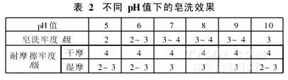 取JY-1103D用量1 g/L,皂洗溫度70℃,時間20 min,浴比1∶15,取不同pH值下的皂洗效果見表2。