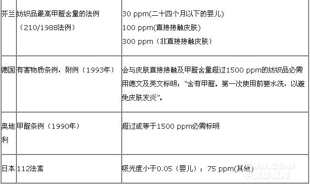 表1世界各國出的法規(guī)或標(biāo)準(zhǔn)對游離甲醛的限定