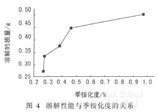 取0. 10 g不同季銨化度的改性稻草秸稈,分別加入到錐形瓶中,加入100 mL蒸餾水,室溫下攪拌1 h,觀察其溶解情況。將離心得到的固體不溶物放入烘箱中烘干,稱重,評價其溶解性能,結果如圖4所示。