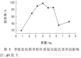 由圖6可以看出,季銨鹽化稻草秸稈的脫色效果很好,適用的pH值范圍廣泛,可以作為一種新型的脫色劑。