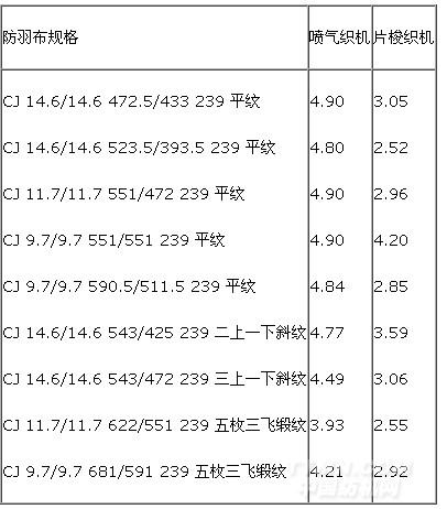 (5)噴氣織機(jī)的開口清晰度和織造張力都高于片梭織機(jī),織造同規(guī)格防羽布,噴氣防羽布的緯向縮率至少是片梭防羽布的1.15倍以上,工藝設(shè)計(jì)時(shí)要充分注意這個(gè)因素。