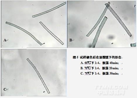 結(jié)果表明,當(dāng)試樣與保險(xiǎn)粉之比為1:0.5時(shí),即使振蕩溫度達(dá)到80℃,時(shí)間延長至40min,效果仍然不理想,纖維色澤較深,難以辨認(rèn)(圖4A)。